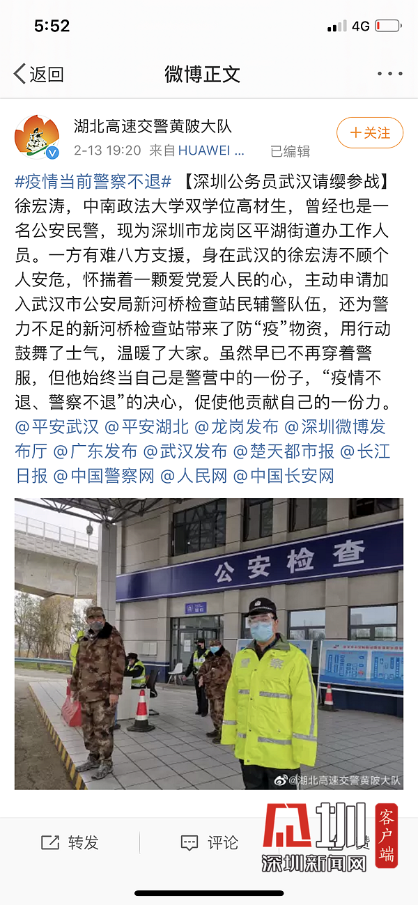 龍崗公務員滯留湖北“變”輔警 把守武漢東北大門