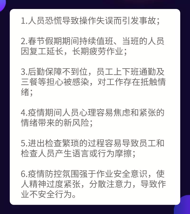 疫情防控和節(jié)后復產(chǎn)復工給企業(yè)安全生產(chǎn)帶來新挑戰(zhàn),如何做好防控措施?哪些風險又要防范?員工又如何自我保護?