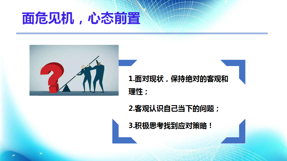 每個人要用一生的時間去修煉一種能力—抗壓能力??箟耗芰褪侨藗兏淖冏约簯峙率?、逃避行動的消極被動的行為習慣,擺脫挫敗、失落、無助的負面消極情緒,能回歸自我、堅定目標、敢于行動的能力。它可以幫助我們在面對焦慮、緊張時,保持絕對的客觀和理性,客觀認識自己當下的問題,并通過積極思考找到應對策略。