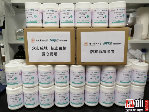 據(jù)悉,首批捐贈的護(hù)目鏡防霧酒精濕巾數(shù)量為6000張(100桶)。該濕巾由孫大陟和南科大首屆畢業(yè)生張至共同發(fā)起創(chuàng)立的深圳南科新材科技有限公司和孫大陟課題組共同緊急研發(fā)趕制,簡單擦拭后可保證護(hù)目鏡鏡片長時(shí)間不起霧,對人體人眼無毒無害,且能起到有效消殺病菌作用。每片濕巾可至少擦拭一副護(hù)目鏡,防霧效果可至少持續(xù)一天,大大節(jié)省了醫(yī)護(hù)人員清潔裝備的時(shí)間,為爭分奪秒抗擊疫情提供了有利條件。