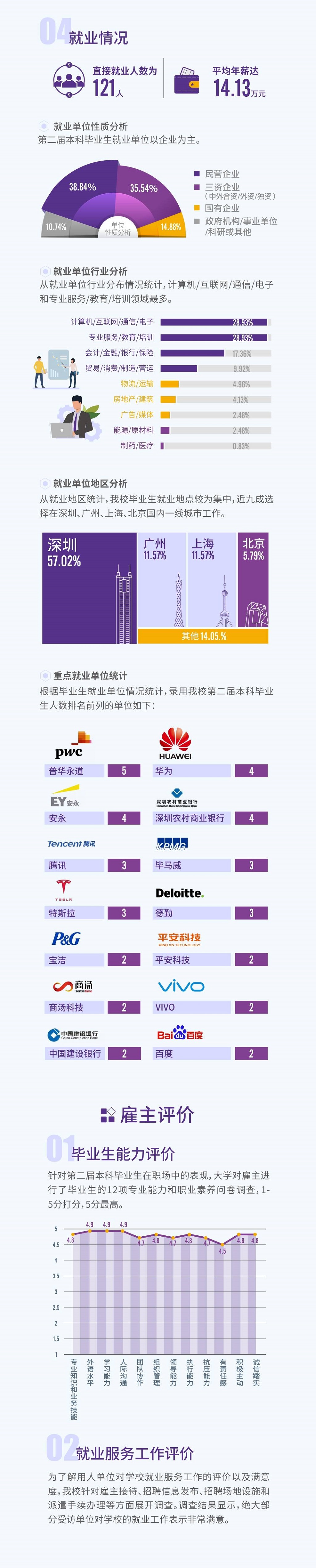 2019年,本科畢業(yè)生就業(yè)單位性質(zhì)更多元。除跨國公司、民營企業(yè)外,更多學(xué)生被國有企業(yè)、事業(yè)單位青睞。數(shù)據(jù)顯示,第二屆本科畢業(yè)生的就業(yè)單位中,民營企業(yè)占38.84%,如華為、百度;三資企業(yè)(中外合資/外資/獨(dú)資)占35.54%,如騰訊、寶潔、可口可樂、四大會計(jì)師事務(wù)所;國有企業(yè)占14.88%;另有10.74%畢業(yè)生受聘于政府機(jī)構(gòu)/事業(yè)單位/科研等機(jī)構(gòu)。