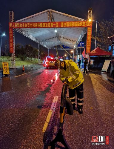 2月16日00:30,坪山丹梓大道防疫檢查點,坪山街道辦應急分隊隊員刁龍為返深司乘人員檢測體溫。(記者邱嘉熙)