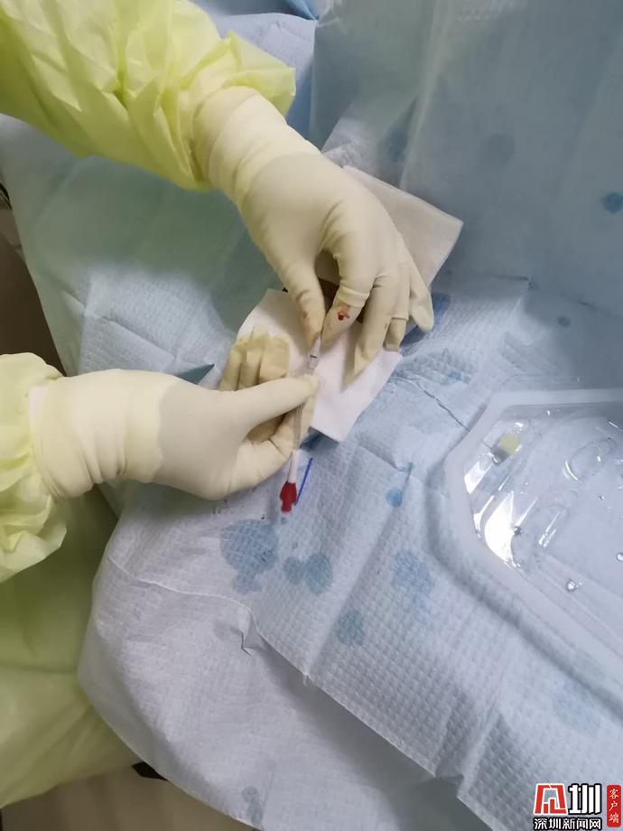 王玲是靜脈??浦委熥o(hù)士,另一名隊(duì)員陳潔麗也是持有 PICC 資格證的護(hù)士。盡管都有上十年的經(jīng)驗(yàn),對(duì)于此次操作兩人還是非常謹(jǐn)慎。王玲說,防護(hù)服帶來的影響,尤其會(huì)體現(xiàn)在手感上。戴上幾層手套后,手感會(huì)變差。受限于當(dāng)?shù)卦O(shè)備,可能不能靠?jī)x器去協(xié)助穿刺,要執(zhí)行 " 盲穿 ",純憑自己的經(jīng)驗(yàn)去完成,是一個(gè)挑戰(zhàn)。等下先評(píng)估下血管條件,希望一切順利,為病人減輕痛苦。