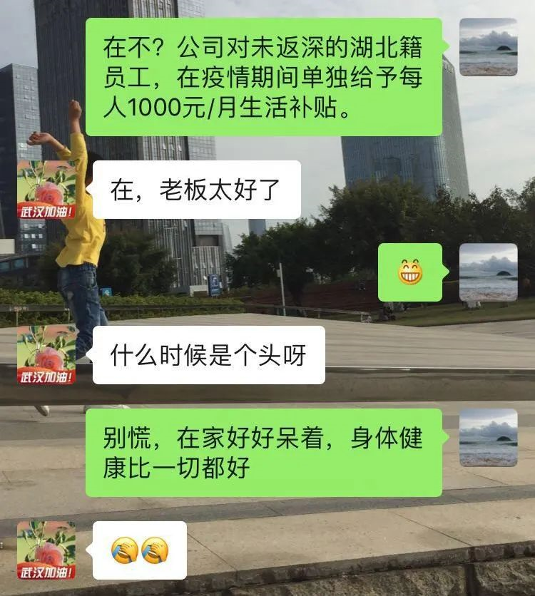 “工資已經(jīng)全額到賬,由于疫情影響,針對不能返程的湖北籍員工,每人額外發(fā)放1000元生活補(bǔ)貼。”2月17日,身在湖北公安的晏君收到公司通知后,懸著的心終于放了下來。晏君是深圳坤弘印務(wù)有限公司倉儲部記賬員,她坦言,公司發(fā)放的工資和生活補(bǔ)助是“雪中送炭”,過去近一個月心里確實(shí)很忐忑,既擔(dān)心沒工資發(fā),又害怕丟了工作,如今不用擔(dān)心經(jīng)濟(jì)來源了?!瓣P(guān)鍵時候,公司不僅沒有拋棄我們,還給我們諸多關(guān)愛。我發(fā)現(xiàn)我更愛公司、更愛我的工作了。”