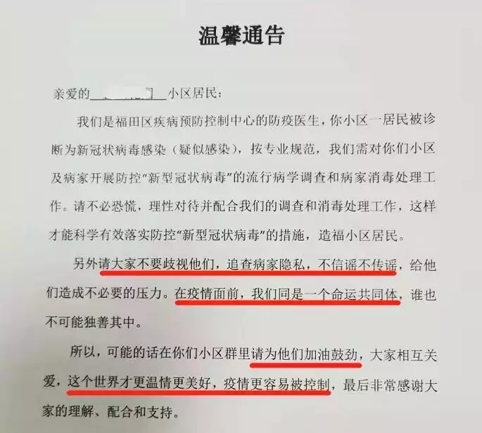 “疫情面前,我們同是一個(gè)命運(yùn)共同體”“大家相互關(guān)愛,這個(gè)世界才更溫情美好,疫情更容易被控制……”1月30日,位于深圳福田區(qū)的一小區(qū)出現(xiàn)新冠肺炎疑似感染病例,福田區(qū)疾病預(yù)防控制中心的防疫醫(yī)生隨即發(fā)布了這則通告,瞬間刷屏了深圳人的朋友圈。通告除了呼吁小區(qū)居民配合調(diào)查及消毒處理工作外,還特地懇請大家“不要歧視,在疫情面前,我們是同一個(gè)命運(yùn)共同體,誰也不可能獨(dú)善其身?!绷攘葦?shù)字的“請求”,感動無數(shù)人。
