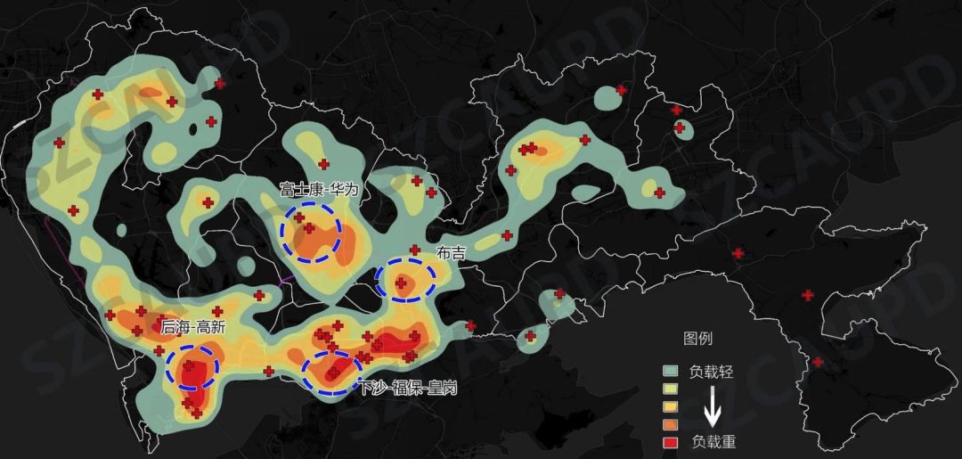 復(fù)工正加快步伐有序地進(jìn)行著,但是疫情防控也到了“最吃勁的關(guān)鍵節(jié)點(diǎn)”,更要穩(wěn)住。輸入性風(fēng)險(xiǎn)增大,加上復(fù)工人員聚集帶來的風(fēng)險(xiǎn),考驗(yàn)著城市管理的能力與效率。此前,深圳的防控風(fēng)險(xiǎn)主要在于“涉疫”小區(qū)。截至2月24日24時(shí),深圳市累計(jì)報(bào)告確診病例417例,分布于250個(gè)小區(qū)(場(chǎng)所),主要集中在城市中心地區(qū)。從下面的數(shù)據(jù)分布圖來看,我們可以看到了特別是在深圳的東南部,數(shù)點(diǎn)相對(duì)密集,而這恰好又與我市科創(chuàng)企業(yè)的分布發(fā)生一定程度的重合。逐步復(fù)工之后,防控重點(diǎn)將轉(zhuǎn)向工作場(chǎng)所。一方面是工作人口的高密度集聚與交往,導(dǎo)致病毒傳染的風(fēng)險(xiǎn)加大,深圳就業(yè)人員高度密集的地區(qū)將是高風(fēng)險(xiǎn)區(qū),如車公廟、高新園、華強(qiáng)北等地區(qū);另一方面,涉疫小區(qū)及其周邊可能會(huì)出現(xiàn)的潛在感染者,將有可能隨著工作通勤進(jìn)一步傳播。基于百度慧眼通勤大數(shù)據(jù)分析涉疫小區(qū)居民的工作地點(diǎn)分布,未來可能涉疫的工作場(chǎng)所主要集中在福田-羅湖-南山中心一帶,并在局部地區(qū)形成集聚區(qū)。而龍華、寶安、龍崗也有局部相對(duì)高集聚的地區(qū)。這些都是深圳近期應(yīng)重點(diǎn)防疫的區(qū)域。▼ 深圳近期應(yīng)重點(diǎn)防疫的空間地圖
