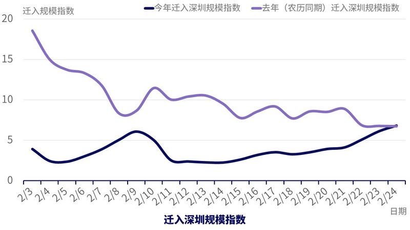 從百度遷徙地圖看到,2月21日起,深圳已連續(xù)4天居全國(guó)熱門遷入地榜首,同時(shí),遷入規(guī)模指數(shù)也逐漸接近去年農(nóng)歷同期水平。