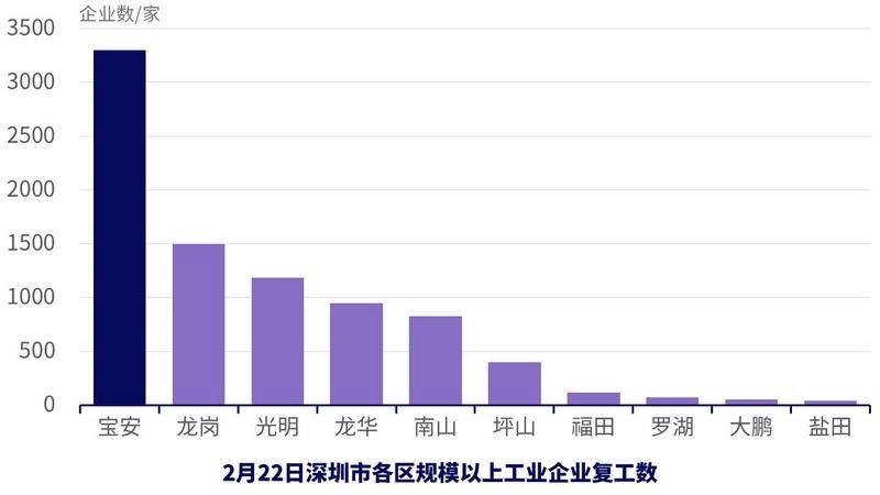 而全市規(guī)模以上企業(yè)復(fù)工數(shù)8424家,復(fù)工率近90%,寶安區(qū)規(guī)模以上企業(yè)的復(fù)工率為100%,光明區(qū)與完全復(fù)工僅毫厘之差。