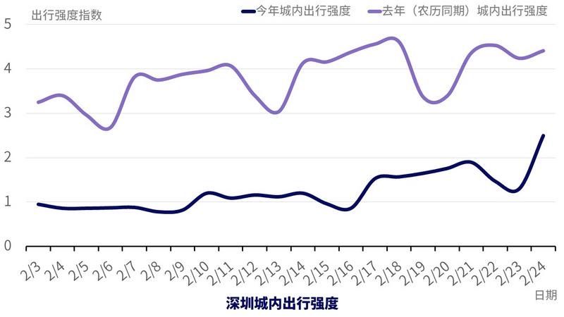 人員的遷入,復(fù)工的進(jìn)行時(shí),讓深圳久違的早高峰再次出現(xiàn),2月24日,深圳早高峰時(shí)段出行車輛42.09萬(wàn)輛,較上一周上升58%,城內(nèi)出行強(qiáng)度達(dá)去年農(nóng)歷同期的56.7%。