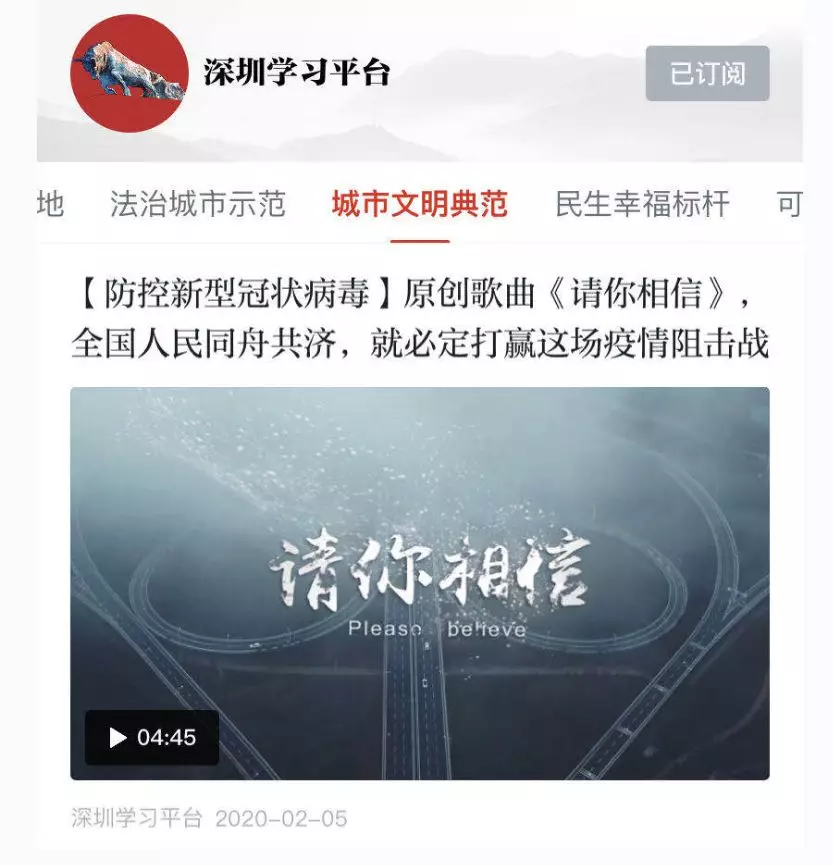 在深圳市委宣傳部的統(tǒng)一部署下,深圳的創(chuàng)作者們在短時間內(nèi)創(chuàng)作出眾多暖人心、聚力量的作品,《請你相信》是首批推出的作品之一。2月5日,《原創(chuàng)歌曲<請你相信>,全國人民同舟共濟,就必定打贏這場疫情阻擊戰(zhàn)》視頻登上“學習強國”全國平臺“推薦”欄目,在朋友圈廣為傳播,反響良好。