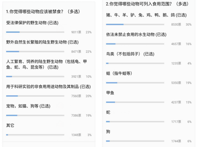 網(wǎng)友投出9011票,贊成“受法律保護(hù)的野生動物”應(yīng)該被禁食,占比23%;另有8471票,22%的網(wǎng)友支持禁食“野外自然生長繁殖的陸生野生動物”。對于“用于科研實驗的非食用用途動物及其制品”選項,有20%的網(wǎng)友(7560票)支持禁食。禁食的投票選項中,還有19%的網(wǎng)友贊成禁食貓狗等寵物(7386票),10%的網(wǎng)友贊成禁食包括龜、甲魚、蛇、鳥、昆蟲等人工繁育、飼養(yǎng)的陸生野生動物,票數(shù)為3921票。