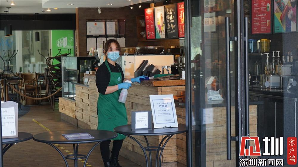 咖啡館都采用門口取餐帶走的銷售模式,圖為正在進行消毒情節(jié)的員工。