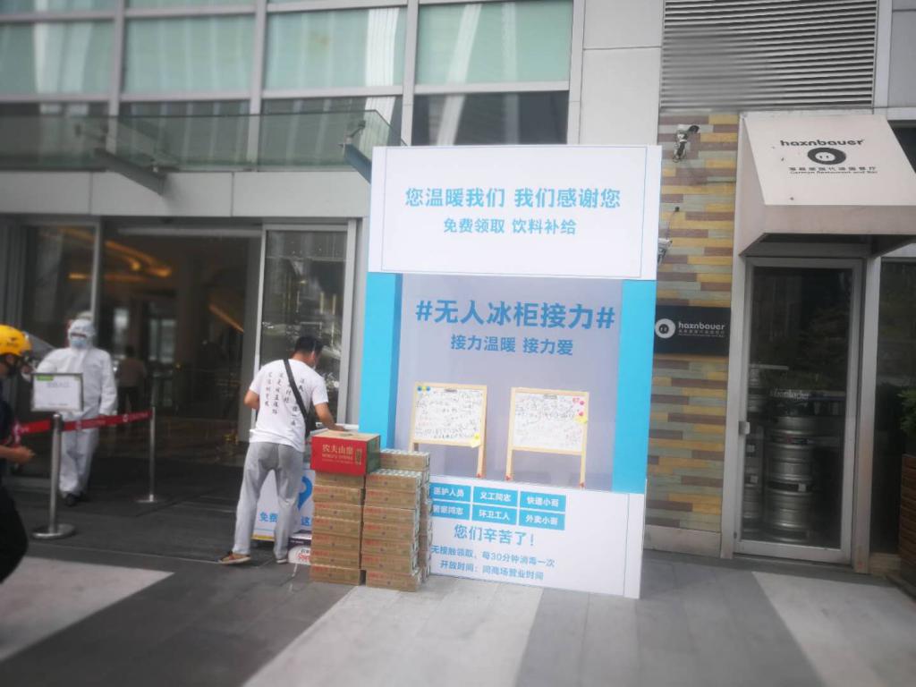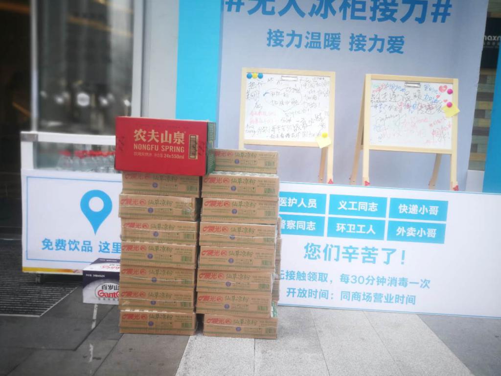 該名工作人員告訴記者,如果冰柜里的飲品沒了,還會有專門的工作人員對冰柜進行巡查,一旦發(fā)現(xiàn)冰柜空了,就會及時補貨?;顒娱_始后,商場內(nèi)許多商家如永輝超市、喜茶、艾薯夫婦、Lady M等都加入了進來。當天中午,必勝客送過來的免費快餐也很受歡迎。