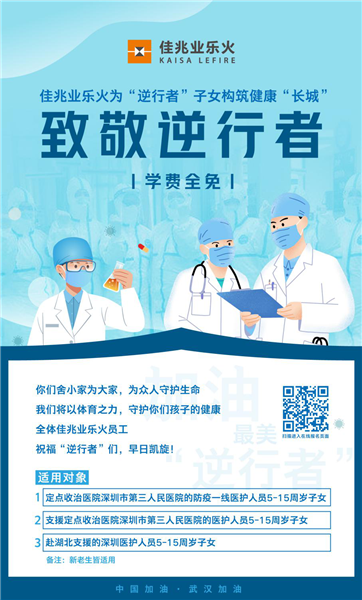 見圳客戶端·深圳新聞網2月29日訊(見圳客戶端、深圳新聞網記者 李云云 通訊員 張慧)突如其來的新冠肺炎疫情牽動著人們的心,在這場沒有硝煙的戰(zhàn)斗中,廣大醫(yī)護人員舍小家為大家,日夜沖鋒守護在一線,成為這個特殊春節(jié)里最美的“逆行者”。日前,記者獲悉,佳兆業(yè)文體集團旗下的佳兆業(yè)樂火國際文體學校將于3月1日到12月31日,為深圳定點收治醫(yī)院——深圳市第三人民醫(yī)院的防疫一線醫(yī)護人員以及赴鄂支援的深圳醫(yī)護人員子女提供免費培訓課程包,為“逆行者”子女構筑健康“長城”。