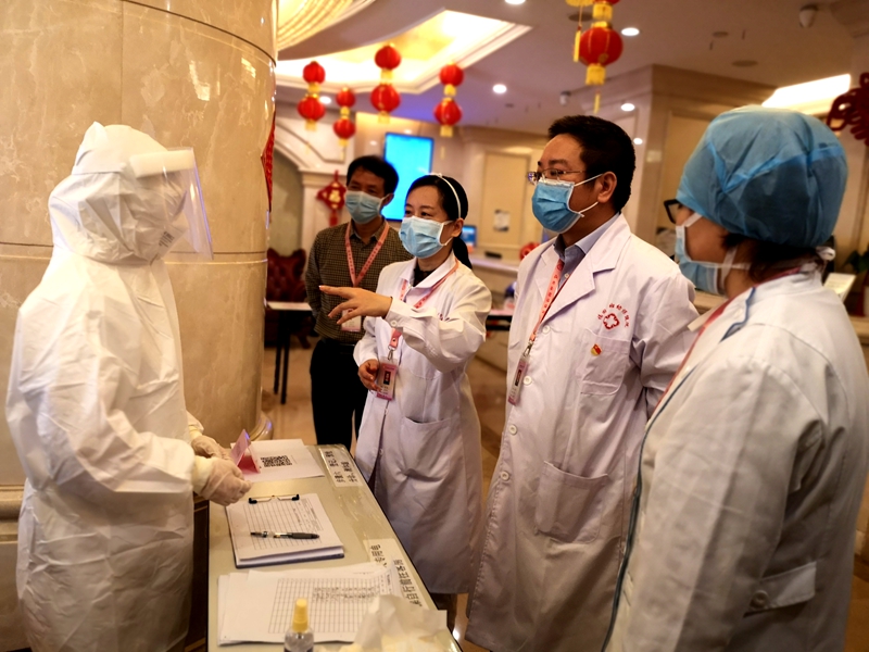 在街道辦、醫(yī)院、酒店、派出所等各部門的積極配合和協(xié)調(diào)下,僅僅41小時,一間停業(yè)的酒店順利啟動成為全區(qū)最大的健康驛站。為了更好的起到內(nèi)防擴散,外防輸入的作用,2月26日上午,福田區(qū)婦幼院、福田街道、福強派出所相關(guān)負責(zé)人帶隊到驛站模擬演練,進一步規(guī)范優(yōu)化流程管理。