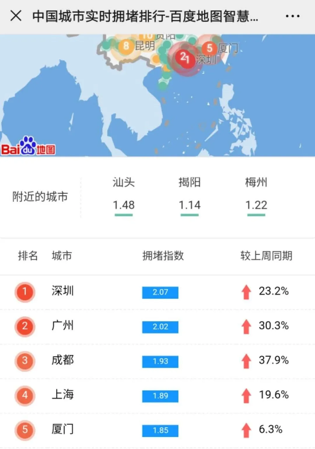 據(jù)百度地圖提供的中國城市實(shí)時擁堵排行來看,3月2日19時許,深圳擁堵指數(shù)為2.07,位居全國榜首。