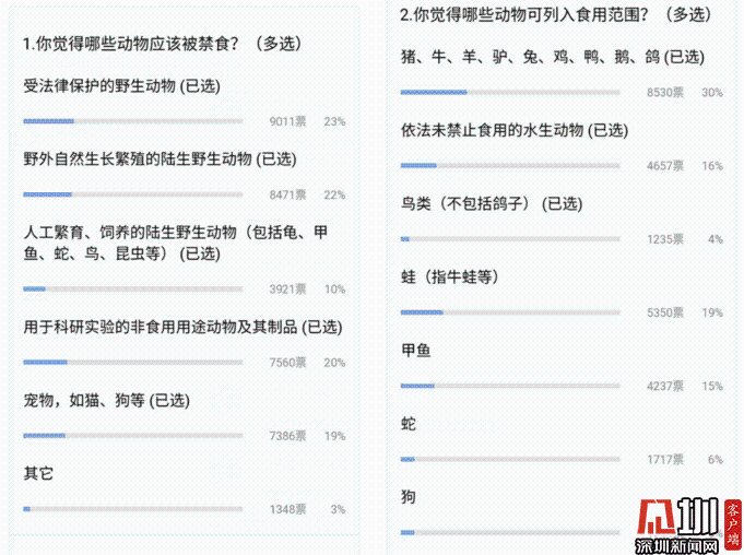 2月26日,深圳新聞網(wǎng)微信公眾號發(fā)布正在征求意見的《條例》后,當(dāng)天傍晚有超過9000名網(wǎng)友參與投票,熱情高漲的網(wǎng)友還留言戲稱廣東菜譜“水魚燜雞”或許從此退出,也有人猜測以田雞(牛蛙)為主打的餐館要“涼涼”了。(相關(guān)報道:深圳最嚴禁食野生動物條例征求意見近萬網(wǎng)友投票:甲魚牛蛙該不該被禁?)