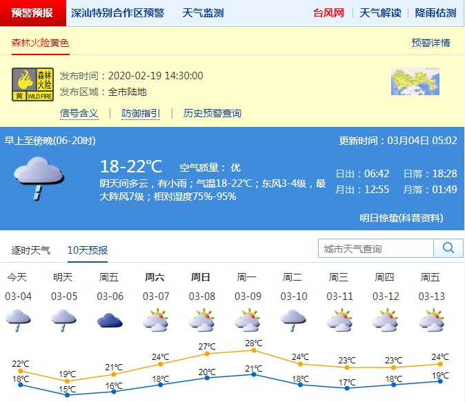 見圳客戶端·深圳新聞網(wǎng)2020年3月4日訊 深圳市氣象臺(tái)預(yù)計(jì),4日我市陰天間多云有小雨,氣溫18-22℃,東風(fēng)3-4級(jí),夜間起沿海和高地有7-8級(jí)陣風(fēng);5日小雨局部中雨,伴有零散雷暴,明顯轉(zhuǎn)涼;6日偶有分散小雨;7日起轉(zhuǎn)多云,氣溫回升。