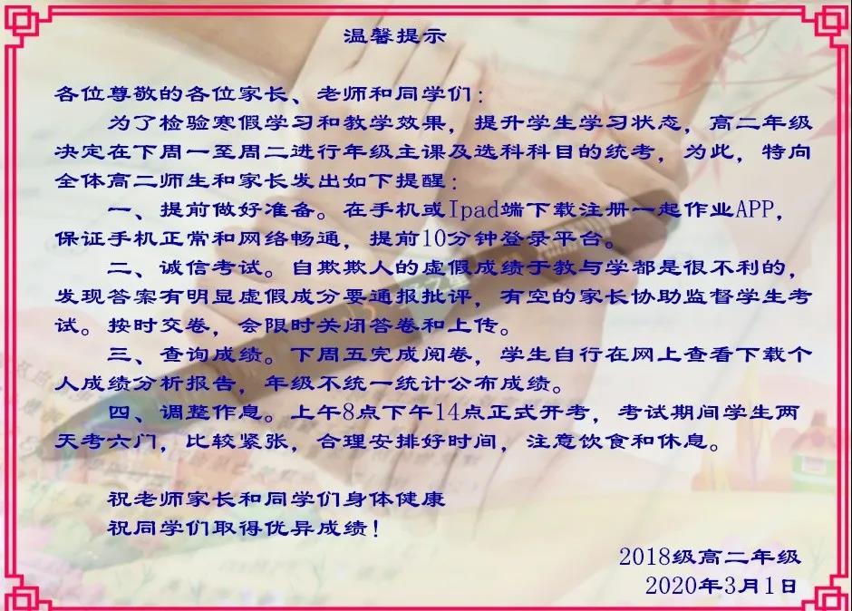 為了提高考試的可信度,考前各班級(jí)還進(jìn)行了誠(chéng)信教育,讓學(xué)生明白誠(chéng)信考試的重要性以及自欺欺人的危害,并發(fā)動(dòng)居家的家長(zhǎng)積極配合監(jiān)考??记?,學(xué)校也向老師學(xué)生和家長(zhǎng)發(fā)了提示,提醒網(wǎng)上考試注意事項(xiàng)。