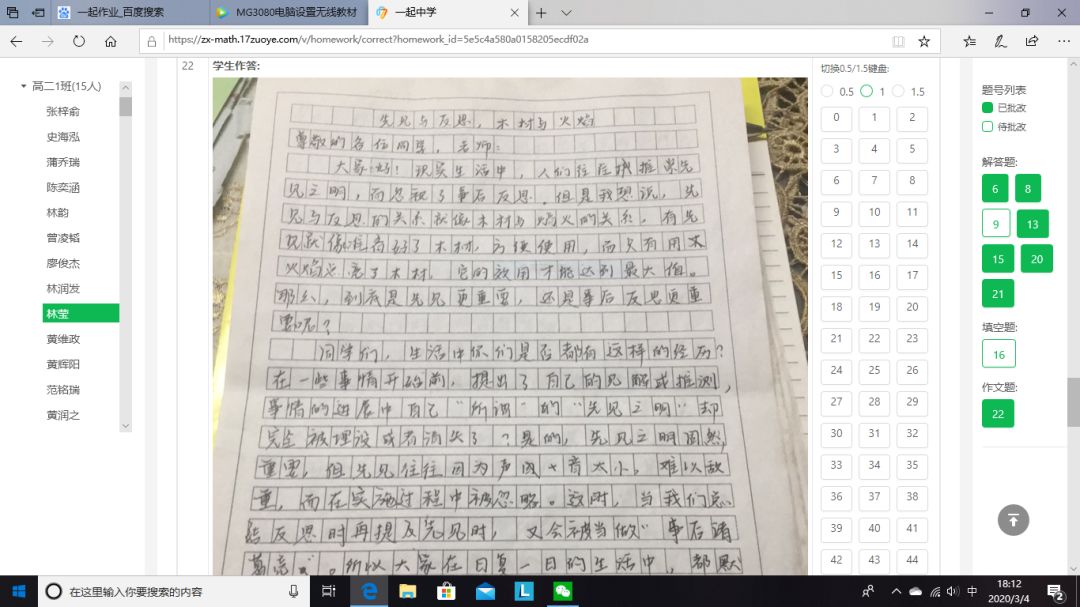 早在網(wǎng)課開始第二周,針對(duì)老師們對(duì)網(wǎng)課效率不高的顧慮,高二年級(jí)就做了一次網(wǎng)上調(diào)查,絕大部分老師贊成進(jìn)行一次網(wǎng)上考試,以檢驗(yàn)網(wǎng)課的學(xué)習(xí)效果,以便調(diào)整教學(xué)。之后,學(xué)校開始著手準(zhǔn)備網(wǎng)上考試,向技術(shù)平臺(tái)提交學(xué)生和老師信息,下發(fā)《一起作業(yè)學(xué)生注冊(cè)登錄指引》和《一起作業(yè)教師作業(yè)批改操作指南》。年級(jí)各備課組開始命題,為了檢驗(yàn)二實(shí)“線上學(xué)堂”的實(shí)效,學(xué)校要求命題的范圍以直播課內(nèi)容為主,兼顧寒假作業(yè)??记耙恢?,各備課組都上交平臺(tái)進(jìn)行試卷制作。2月26日,網(wǎng)上作業(yè)批改功能正式上線,高二年級(jí)要求備課組在考試之前至少利用線上平臺(tái)布置批改一次網(wǎng)上作業(yè),積累經(jīng)驗(yàn),提醒平臺(tái)改進(jìn)不完善的問(wèn)題,及時(shí)更新,同時(shí)讓學(xué)生和老師熟悉操作技巧。備課組在考前都向?qū)W生發(fā)布了考試注意事項(xiàng),要求學(xué)生豎拍照片,注意字跡大小和拍照清晰度,單題上傳,試卷在閱讀頁(yè)面和題目設(shè)置也做了優(yōu)化,大大方便了學(xué)生答題,有效減輕老師改卷負(fù)擔(dān),提高了閱卷的效率。