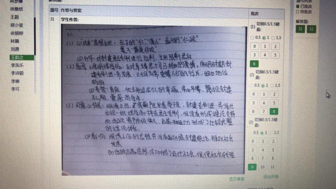 “考試期間,家長(zhǎng)們積極配合監(jiān)考,上傳照片;各班班主任全程陪考,隨時(shí)反饋解決班級(jí)學(xué)生出現(xiàn)的考試問(wèn)題;各備課組老師網(wǎng)上巡考,提醒學(xué)生答題注意事項(xiàng),在線隨時(shí)回答和處理學(xué)生疑問(wèn);平臺(tái)的技術(shù)支持人員全天候?qū)B氃诰€服務(wù),全力解答考試中的技術(shù)問(wèn)題?!倍?shí)高二年級(jí)主任宋德勝告訴記者,兩天的“云考試”,整體非常順利,網(wǎng)絡(luò)平穩(wěn),全年級(jí)395人參加考試,無(wú)一缺考,全部上傳了試卷。他表示,高二年級(jí)作為廣東省首屆新高考改革年級(jí),也成為了這次“云考試”的試點(diǎn)年級(jí),每位學(xué)生的考試科目除語(yǔ)數(shù)外三門必考,其余根據(jù)自己選科情況六選三,每個(gè)學(xué)生考六科。目前,現(xiàn)在各備課組已經(jīng)投入緊張的閱卷中,確保周五前完成閱卷任務(wù)。