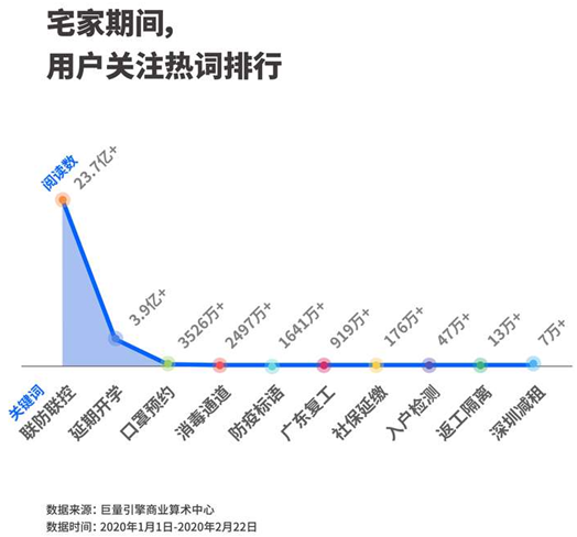 在1月1日至2月22日的頭條用戶閱讀數(shù)據(jù)中,聯(lián)防聯(lián)控、延期開學、口罩預約成為頭條平臺上最熱的關鍵詞前三位。此外、社保延繳、返工隔離等政府措施都被疫情下的手機用戶頻繁閱讀。
