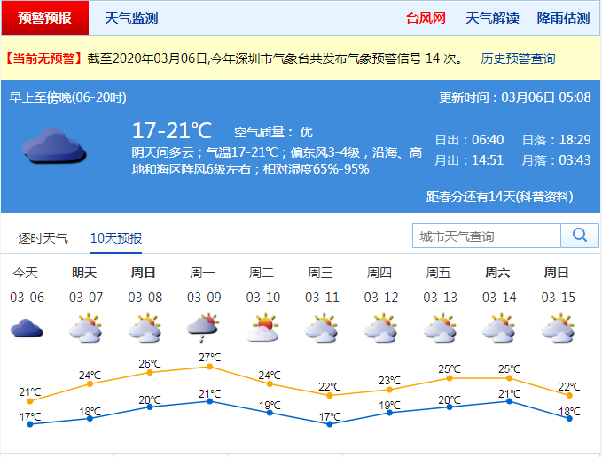 見圳客戶端·深圳新聞網(wǎng)2020年3月6日訊 深圳市氣象局預(yù)計(jì)6日陰天間多云,沿海、海區(qū)和高地陣風(fēng)6-7級(jí),16-21℃;7-9日可見陽(yáng)光,早晚有輕霧;9日夜間至10日冷空氣影響,有雷陣雨,沿海、海區(qū)和高地陣風(fēng)7-8級(jí),天氣再次轉(zhuǎn)涼;11-12日多云間陰天。
