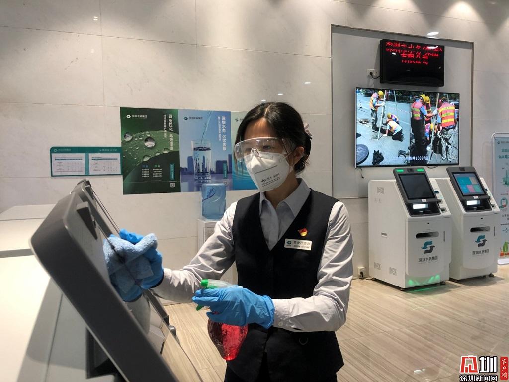 福田分公司福田營(yíng)業(yè)廳楊麗娜,正對(duì)自動(dòng)服務(wù)機(jī)進(jìn)行消毒。