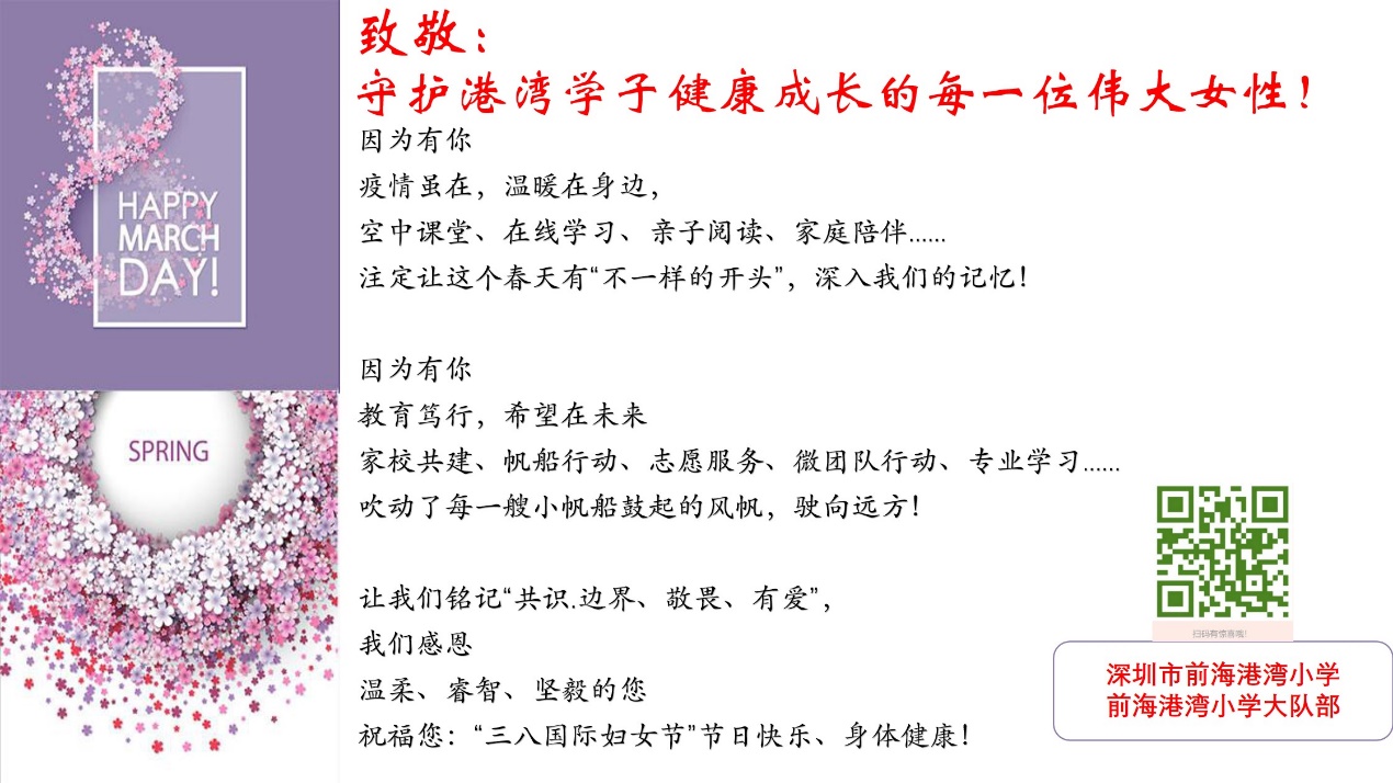 3月8日,“國際婦女節(jié)”,在這個(gè)特殊的節(jié)日里,前海港灣小學(xué)又是怎樣給“女神們”過節(jié),學(xué)校又送了哪些溫馨的祝福,一起來看一看:
