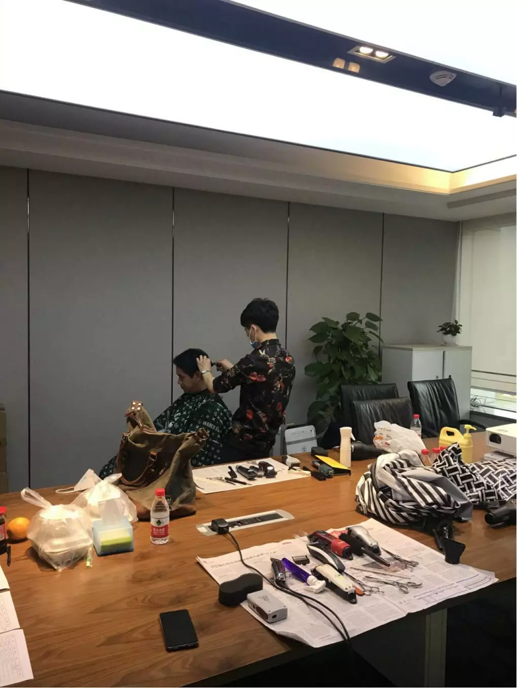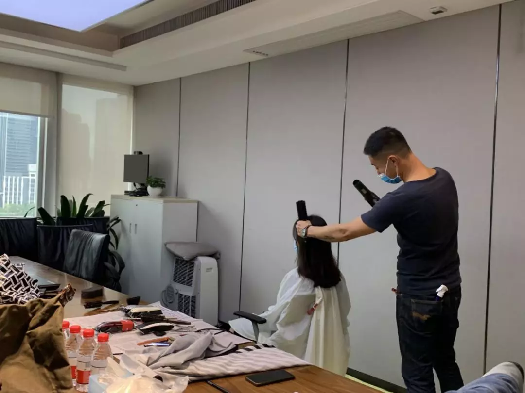 公司本部,1303會(huì)議室,臨時(shí)理發(fā)室“生意”也火爆極了。公司工會(huì)邀請(qǐng)了兩名專業(yè)的Tony老師,為近90名員工提供免費(fèi)的理發(fā)服務(wù)。為減少人員聚集,理發(fā)采取提前線上預(yù)約,分時(shí)段進(jìn)行,確保安全的同時(shí),盡可能讓有需要的同事都能理上發(fā)。鋪上一次性地毯,坐上椅子,圍上一次性“斗篷”,Tony老師一頓熟練的剪發(fā)操作后,再用吹風(fēng)機(jī)整好造型,就完成了理發(fā)的全過程。臨時(shí)理發(fā)師的搭建,有效解決了員工生活上的困難,幫助他們以良好的精神面貌投入工作來。