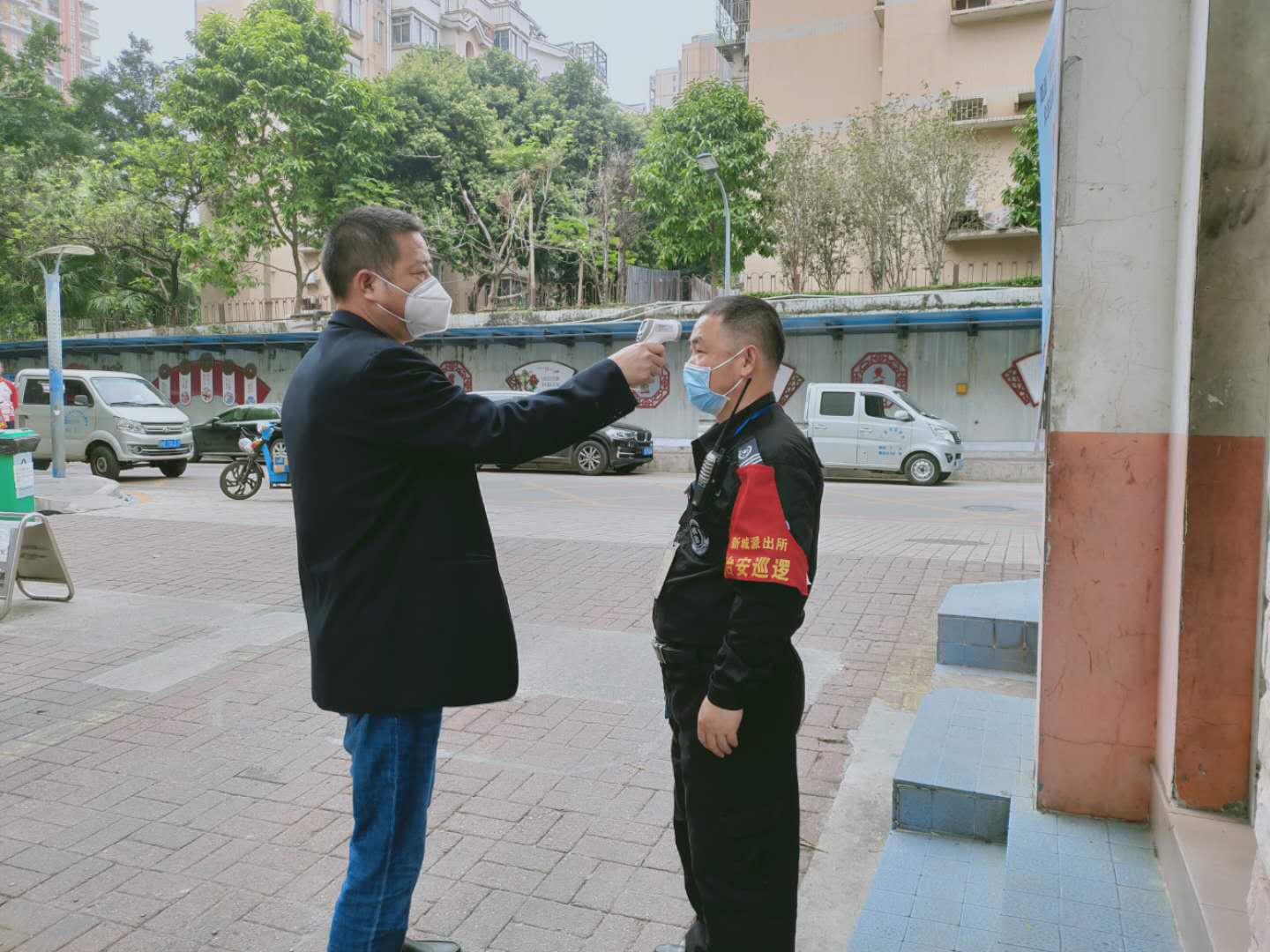 曾志軍為小區(qū)工作人員測(cè)量體溫