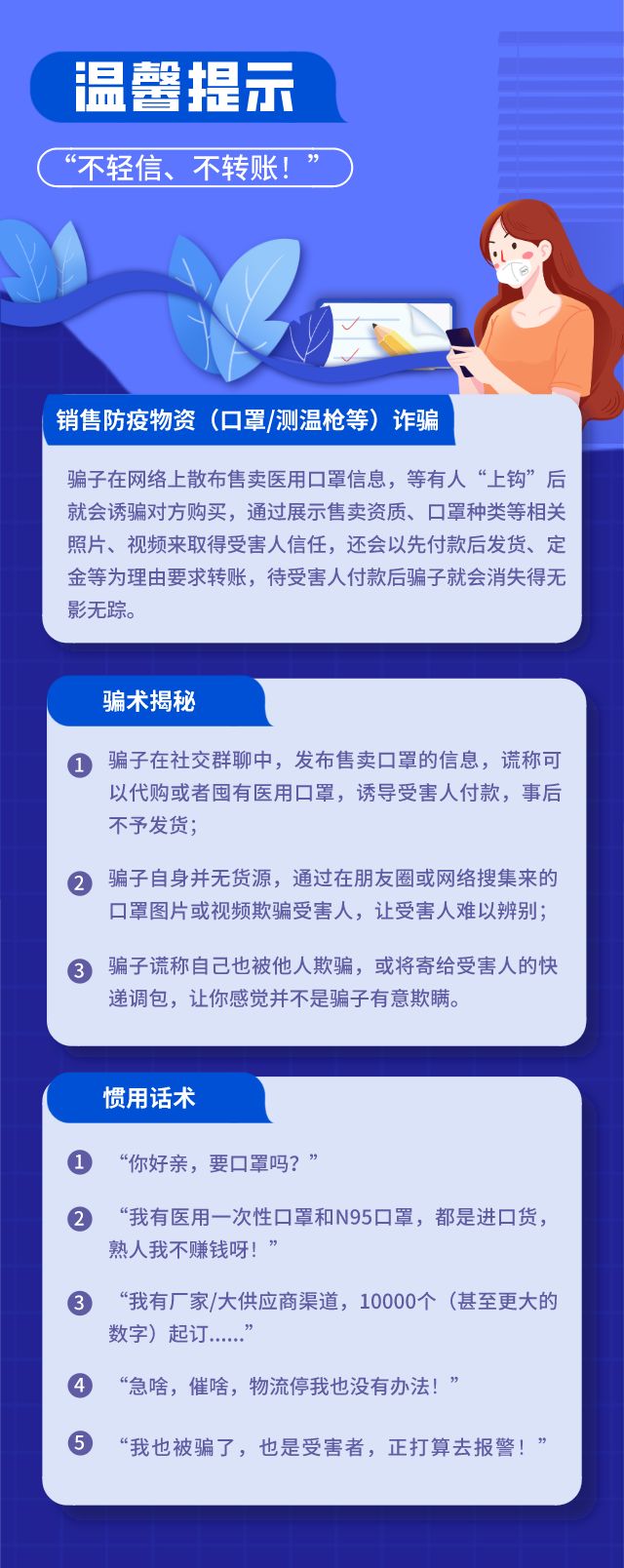 “我來報警!群里有人騙我口罩錢!” 3月4日,事主李小姐匆匆來到深圳市公安局福田分局香蜜湖派出所報案并講述了自己被騙的經(jīng)過。 此前李小姐在某社區(qū)賣菜群里,看到了一名群友發(fā)布“口罩資源”的信息,于是加其為好友,對方向李小姐展示了售賣資質(zhì)以及售賣口罩的樣品,一步步讓李小姐放松了警惕,雙方以1.75元/個醫(yī)用口罩、9元/個N94口罩的價格談妥交易。 隨后李小姐通過轉(zhuǎn)賬先向?qū)Ψ劫徺I了一批口罩。李小姐覺得對方還挺靠譜的,就又分四次向?qū)Ψ睫D(zhuǎn)賬,分別郵寄給自己不同的朋友,累計向?qū)Ψ睫D(zhuǎn)賬了990元。 不料所有的錢轉(zhuǎn)過去之后,這個群友卻消失了,發(fā)信息不回,打視頻不接,雖未拉黑但也沒任何回應?!笆謿馊耍或_的錢雖然不多,但是一定要給詐騙分子嚴懲!”李小姐對民警這樣講述道。 民生小案無小事,數(shù)百元現(xiàn)金被騙,電單車被盜……這些看似平常的一件件“小”案,背后牽連的卻是廣大群眾的幸福感、安全感。 香蜜湖派出所民警聚力破小案,服務大民生,做到有案必偵,快偵快破。經(jīng)多方面調(diào)查后,最終確定了嫌疑人的身份——游某。3月9日11時許,福田警方將嫌疑人游某抓獲。 ▲嫌疑人通過網(wǎng)絡發(fā)布虛假信息進行詐騙 據(jù)了解,游某于2019年下半年來到深圳,此前加入了一個社區(qū)賣菜群。不久前,游某因手頭緊,于是就在群里發(fā)布消息,謊稱自己有大量口罩待出售。 游某在群里發(fā)布買賣“口罩”信息,會不會還有其他的受害者?這是民警第一時間的直覺。隨著調(diào)查的深入,民警發(fā)現(xiàn)還有其他受害者與游某聯(lián)系購買“口罩”及多筆手機轉(zhuǎn)賬記錄,金額雖然不大,大多為80元、100元、115元、175元……各個個案的涉案金額看起來都是“小錢”,但我們的民警還是盡心盡力,絲毫沒有放松,一項項認真核實并一一做好記錄。 據(jù)初步統(tǒng)計,從1月30日至今,游某通過向他人售賣口罩實施詐騙,累計詐騙4000余元,被騙的受害人多達16人! ▲民警抓獲嫌疑人 現(xiàn)游某對利用網(wǎng)絡實施口罩詐騙的行為供認不諱,已被警方依法刑事拘留,在香蜜湖派出所民警的聯(lián)系下,目前已有受害群友相繼前來協(xié)助調(diào)查,案件仍在進一步調(diào)查中。 ▲民警審訊嫌疑人 警言警語 香蜜湖派出所 民警鄭卓 疫情期間,不少企業(yè)和個人紛紛采購口罩等防護用品。針對利用口罩等防疫物資實施詐騙等違法犯罪行為的不法分子,福田警方堅決從嚴從快依法打擊。廣大市民謹記,購買口罩、消毒液等防疫物資,要通過正規(guī)途徑,做到“不輕信、不轉(zhuǎn)賬”,避免上當受騙。