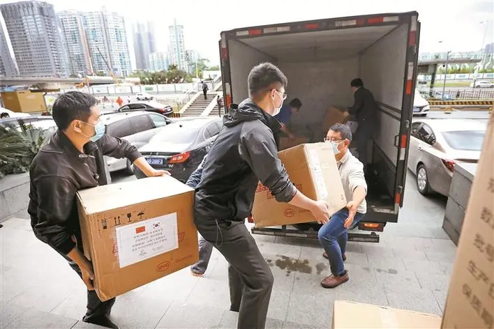 3月18日15時(shí),位于福田區(qū)深南中路的NEO大廈B座一層,一批即將寄往韓國仁川、光陽、釜山三座城市的防疫物資已經(jīng)集結(jié)完畢。深圳市國際交流合作基金會(huì)的工作人員正緊鑼密鼓地準(zhǔn)備著,1個(gè)小時(shí)后,這批近500公斤的一次性口罩將被裝車運(yùn)往機(jī)場。