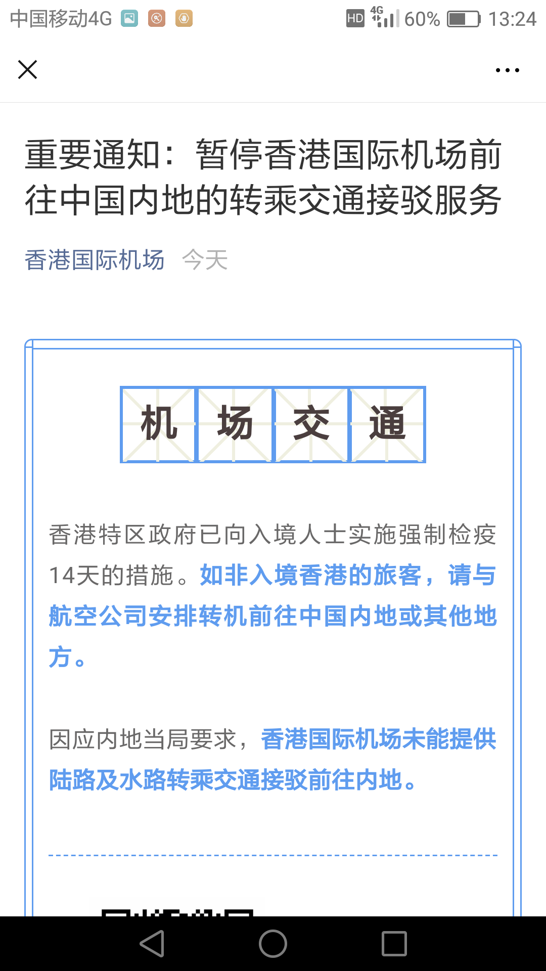 22日早間,來自香港國際機(jī)場的消息稱,香港特區(qū)政府已向入境人士實施強制檢疫14天措施,香港國際機(jī)場將不能提供陸路及水路轉(zhuǎn)乘交通接駁前往內(nèi)地。