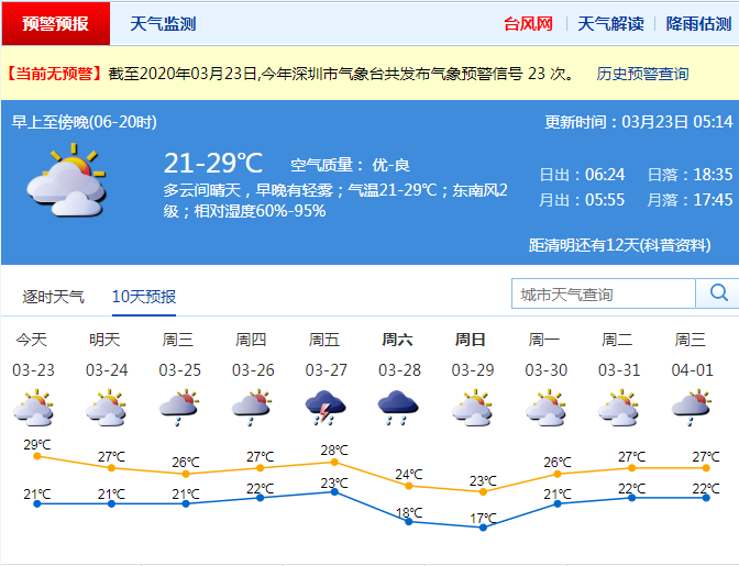深圳今天多云間晴天,早晚有輕霧;氣溫21-29℃;東南風(fēng)2級;相對濕度60%-95%。