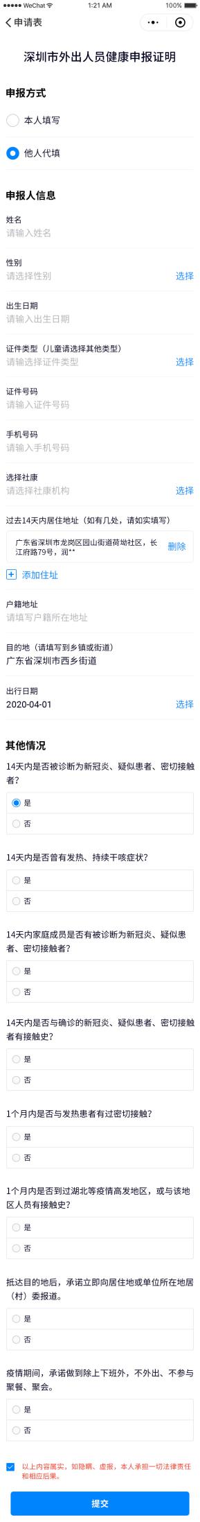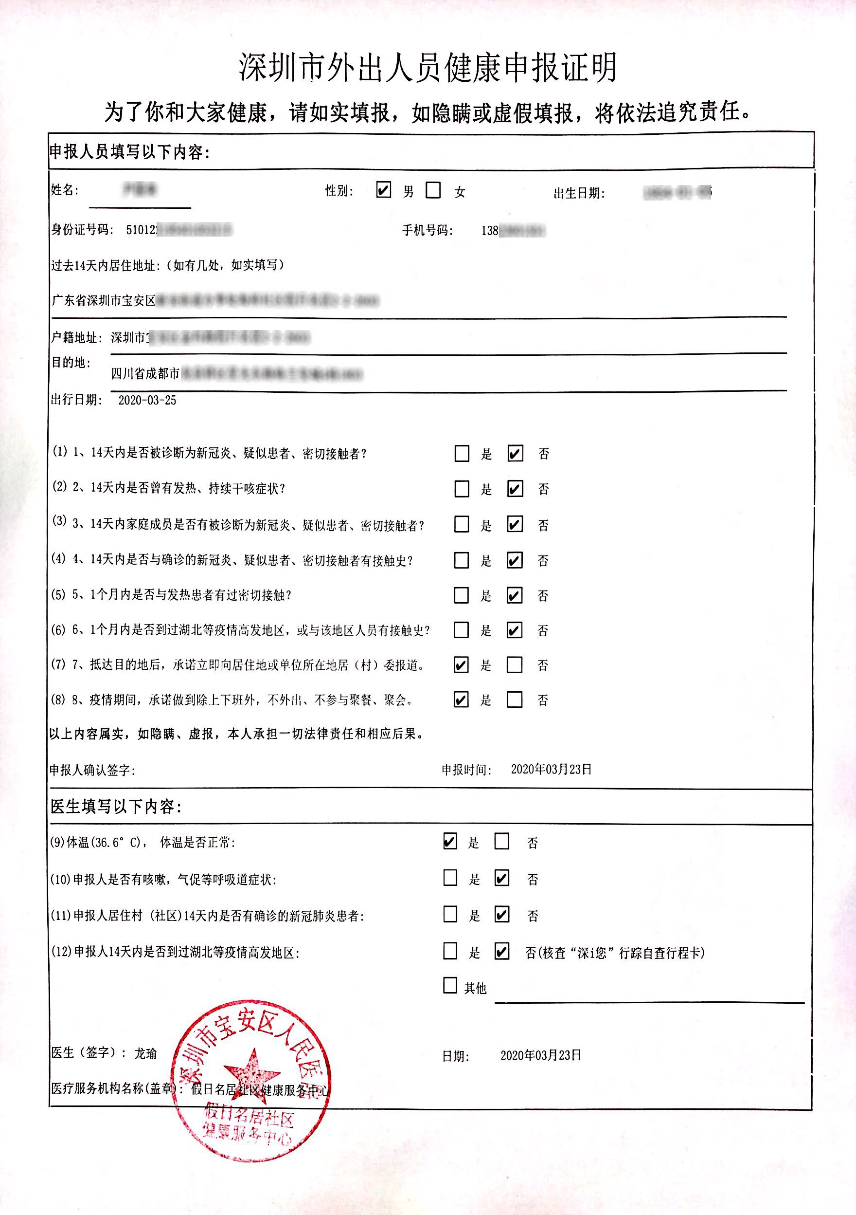 目前,深圳全市所有社康均可出具 《深圳市外出人員健康申報(bào)證明》。需要提醒的是,沒(méi)有微信的老人和小孩可由他人代填,此外,如果出行日期和目的地等有所變更,市民只需重新申報(bào)即可。