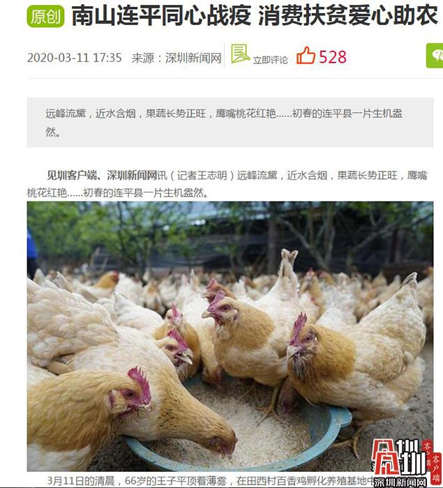 今年新冠肺炎疫情發(fā)生以后,南連農(nóng)業(yè)對(duì)口幫扶的河源連平四個(gè)基地受到影響,共有近2萬(wàn)只百香雞待銷,其中連平縣田源鎮(zhèn)田西村基地的6000多只百香雞無(wú)人問(wèn)津。就在村民一籌莫展的時(shí)候,深圳新聞網(wǎng)等媒體知曉后,迅速進(jìn)行深度采訪,3月11日刊發(fā)了《南山連平同心戰(zhàn)疫 消費(fèi)扶貧愛(ài)心助農(nóng)》的報(bào)道,呼吁深圳的企事業(yè)單位以及愛(ài)心市民,通過(guò)“以購(gòu)代捐”“以買(mǎi)代幫”的方式參與消費(fèi)扶貧,幫助連平農(nóng)戶們渡過(guò)難關(guān)。