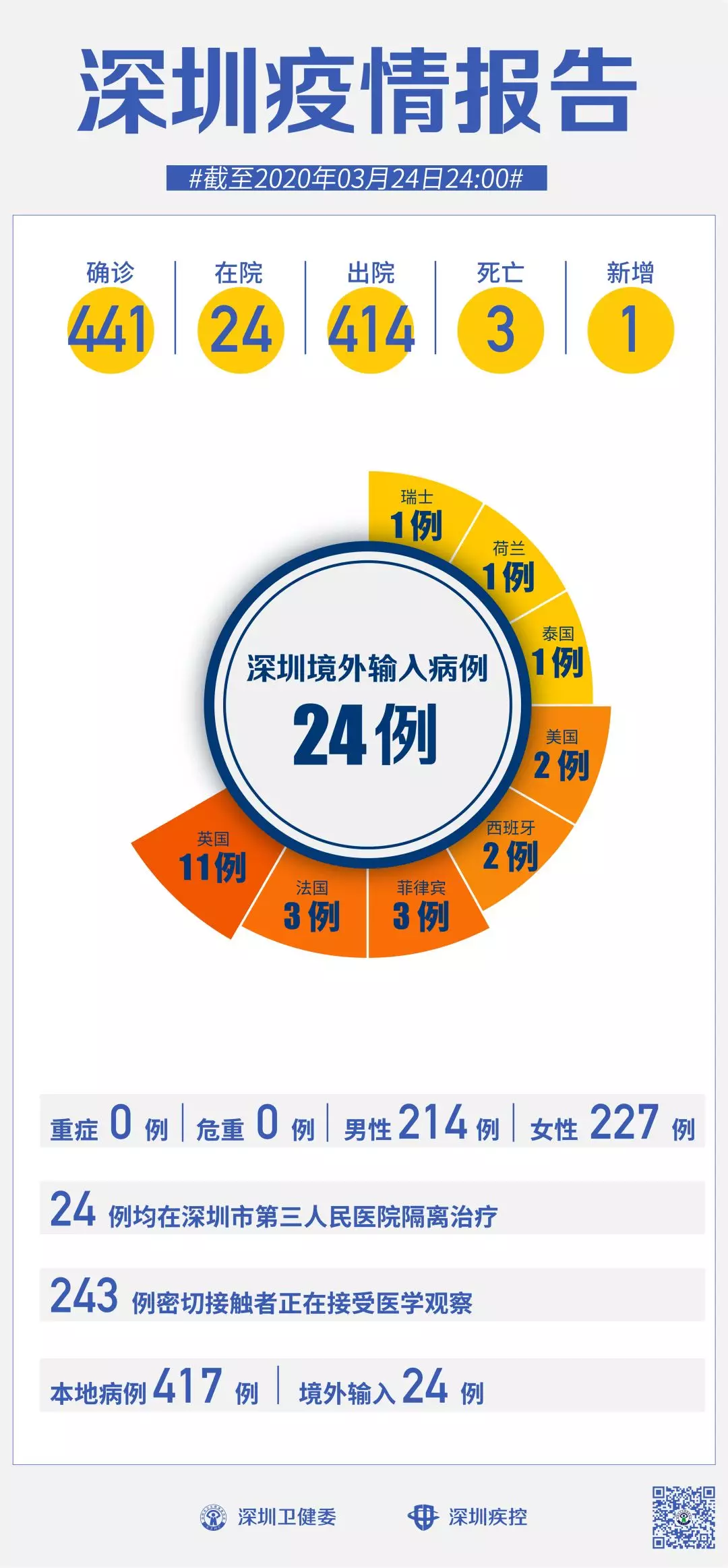 3月24日,深圳確診1例境外輸入“新冠肺炎”新病例,累計達24例。 病例24 男,31歲,巴西籍,在深圳工作,由英國返回。3月21日從英國倫敦乘坐SQ305航班飛往新加坡,22日從新加坡乘坐CZ3040航班飛往中國廣州,當晚經(jīng)廣州白云機場入境,入境體溫36.6℃。23日凌晨由專車送往深圳集中隔離觀察,24日新冠病毒核酸初篩陽性,當天深圳市疾控中心復(fù)核亦為陽性。 目前患者已被轉(zhuǎn)到深圳市第三人民醫(yī)院隔離治療。經(jīng)初步判定,在中國內(nèi)地有32名密切接觸者,已集中隔離。 截至3月24日24時,深圳累計報告“新冠肺炎”病例441例。3月24日當天新增1例。 累計報告確診病例中,男性214例、女性227例。 目前,死亡3例,累計出院414例。 24例確診病例均在深圳市第三人民醫(yī)院隔離治療。 243名密切接觸者正在接受醫(yī)學(xué)觀察。 資料來源:深圳市疾控中心、深圳市衛(wèi)健委、廣東省衛(wèi)健委