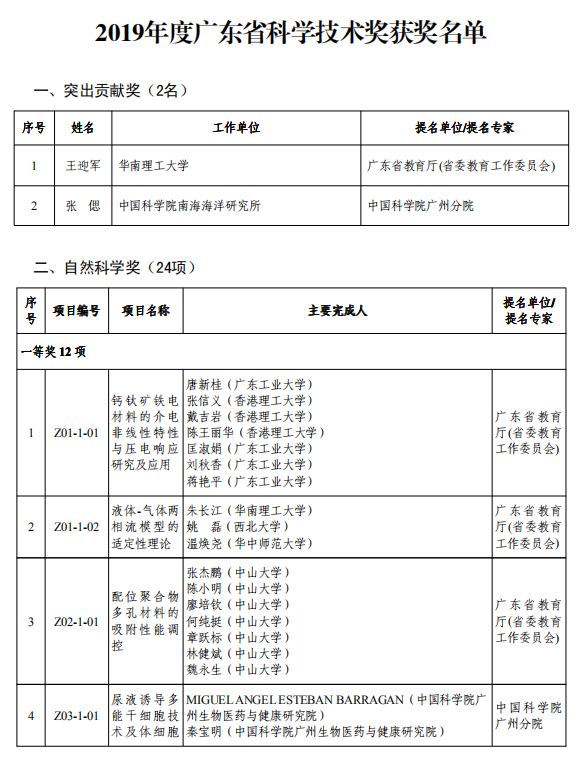 其中,2019年度廣東省科學技術突出貢獻獎的獲獎者分別為:中國工程院院士、亞太材料科學院院士、華南理工大學教授王迎軍;中國工程院院士,國內外著名海洋生態(tài)工程專家,中科院南海海洋研究所所長、研究員張偲。