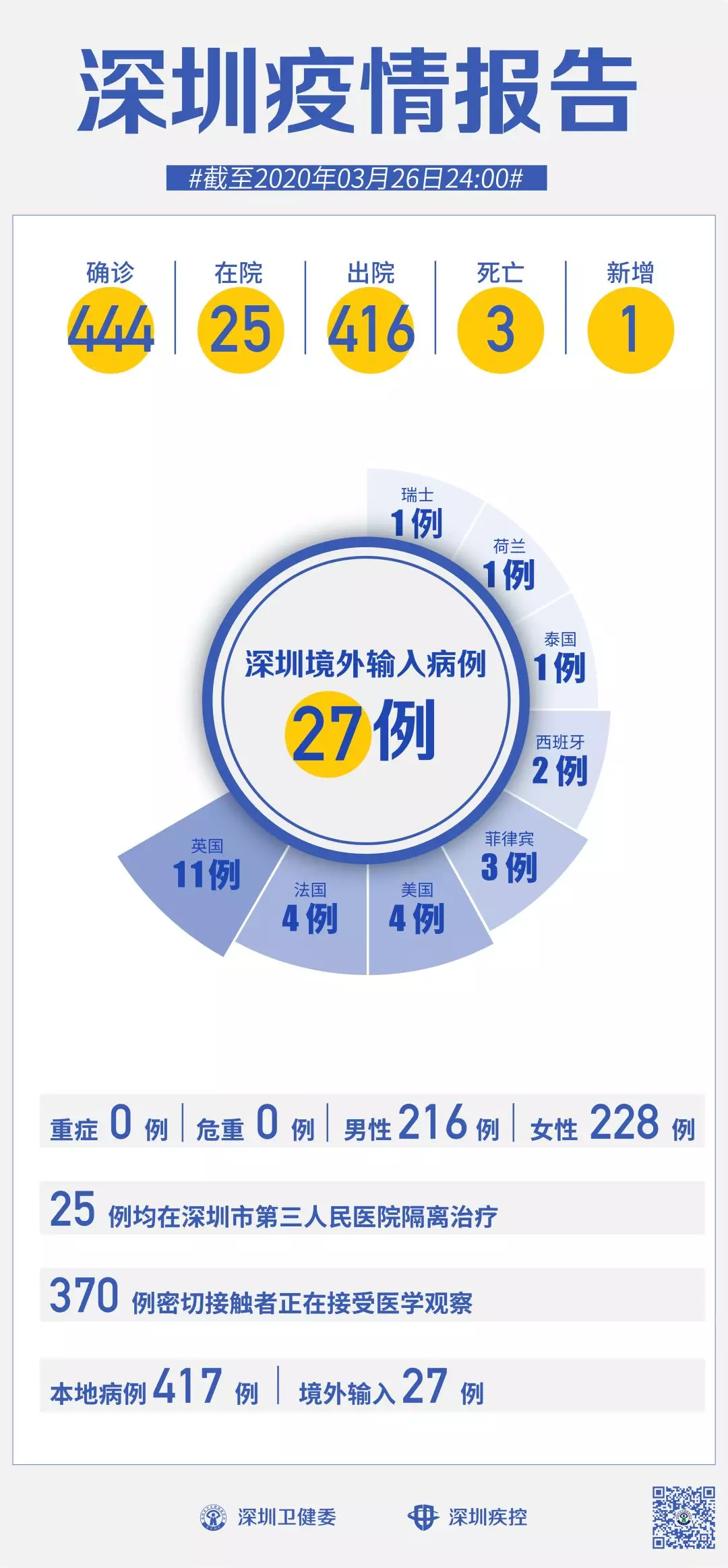 3月26日,深圳確診1例境外輸入“新冠肺炎”新病例,累計(jì)達(dá)27例。 截至3月26日24時,深圳累計(jì)報告“新冠肺炎”病例444例。3月26日當(dāng)天新增1例,出院1例。 累計(jì)報告確診病例中,男性216例、女性228例。 目前,死亡3例,累計(jì)出院416例。 25例確診病例均在深圳市第三人民醫(yī)院隔離治療。 370名密切接觸者正在接受醫(yī)學(xué)觀察。 來源:深圳市疾控中心、深圳市衛(wèi)健委、廣東省衛(wèi)健委