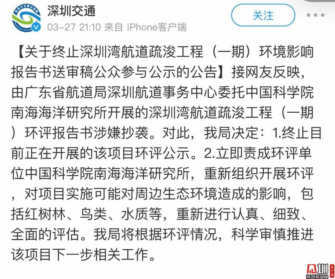 3月27日21時(shí)10分,深圳市交通運(yùn)輸管理局官方微博發(fā)布消息稱:接網(wǎng)友反映,由廣東省航道局深圳航道事務(wù)中心委托中國(guó)科學(xué)院南海海洋研究所開展的深圳灣航道疏浚工程(一期)環(huán)評(píng)報(bào)告書涉嫌抄襲。對(duì)此,深圳市交通運(yùn)輸管理局決定:1.終止目前正在開展的該項(xiàng)目環(huán)評(píng)公示。2.立即責(zé)成環(huán)評(píng)單位中國(guó)科學(xué)院南海海洋研究所,重新組織開展環(huán)評(píng),對(duì)項(xiàng)目實(shí)施可能對(duì)周邊生態(tài)環(huán)境造成的影響,包括紅樹林、鳥類、水質(zhì)等,重新進(jìn)行認(rèn)真、細(xì)致、全面的評(píng)估。深圳市交通運(yùn)輸管理局將根據(jù)環(huán)評(píng)情況,科學(xué)審慎推進(jìn)該項(xiàng)目下一步相關(guān)工作。
