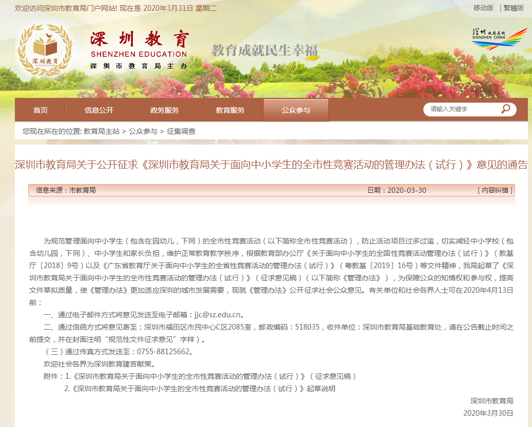 為保障公眾的知情權和參與權,提高文件草擬質量,使《管理辦法》更加適應深圳的城市發(fā)展需要,深圳市教育局現(xiàn)就《辦法》公開征求社會公眾意見。有關單位和社會各界人士可在2020年4月13日前:
