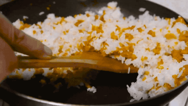 油鍋燒熱,不斷翻炒海膽,直到把海膽的水分炒干,只有動作快和把握好火候,才能保留海膽的鮮度。海膽炒得呈粒狀就可加入蒜蓉,這樣可以更好地刺激海膽香味。把米飯和海膽融合一起翻炒,使每一粒米飯都充分接觸油和熱量,這樣的炒飯才會松軟可口。最后加一點醬油,灑上一把蔥花銷魂的海膽炒飯就出爐啦。