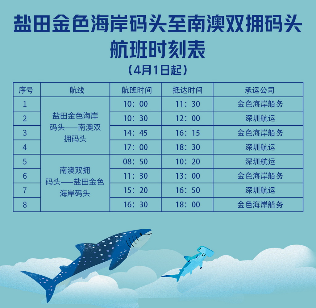 據(jù)了解,“鹽田-南澳”海上交通往返航線自3月12日正式復(fù)航,每天共4班。深圳航運(yùn)集團(tuán)增開(kāi)后,該航線航班數(shù)量將恢復(fù)至疫情前的水平,達(dá)到每天8班。其中,由鹽田金色海岸碼頭至南澳雙擁碼頭新增航班時(shí)間為:10時(shí)30分和17時(shí);由南澳雙擁碼頭至鹽田金色海岸碼頭新增航班時(shí)間為8時(shí)50分和15時(shí)20分。廣大市民及旅客朋友可通過(guò)深圳航運(yùn)旗下公眾號(hào)“鵬星會(huì)”查詢航班信息及訂票,單程成人票60元/人。