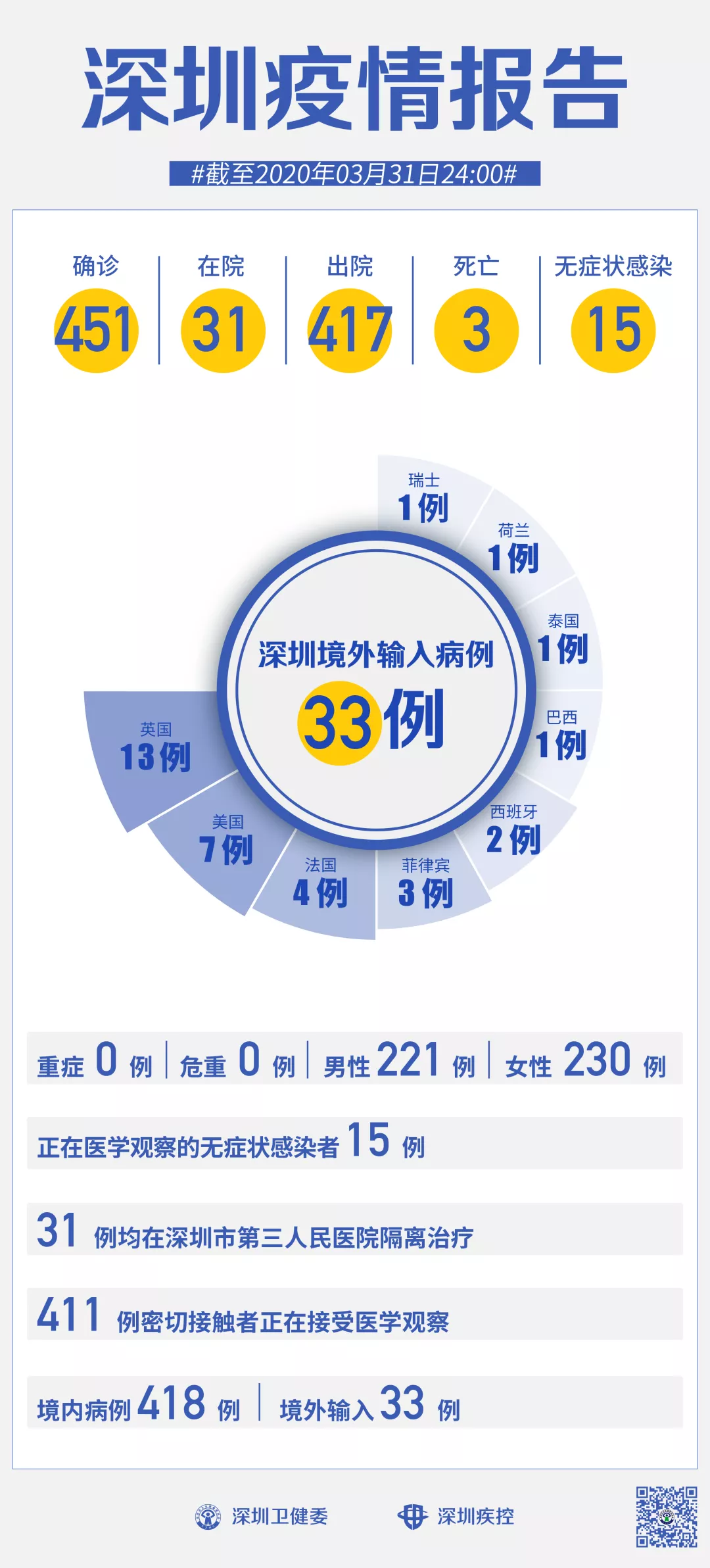 截至3月31日24時(shí),深圳累計(jì)報(bào)告新冠肺炎病例451例。3月31日當(dāng)天新增境內(nèi)病例1例、無(wú)癥狀感染者1例。 【境內(nèi)病例】:新增1例湖北返深確診病例,出院1例,累計(jì)報(bào)告境內(nèi)病例418例。 【境外輸入】:當(dāng)日無(wú)新增病例,累計(jì)報(bào)告境外輸入病例33例。 【無(wú)癥狀感染者】:新增1例湖北返深無(wú)癥狀感染者。全市尚在醫(yī)學(xué)觀察的無(wú)癥狀感染者15例,其中境外輸入9例。 累計(jì)報(bào)告確診病例中,男性221例、女性230例。 目前,死亡3例,累計(jì)出院417例。31例確診病例均在深圳市第三人民醫(yī)院隔離治療。 411名密切接觸者正在接受醫(yī)學(xué)觀察。 無(wú)癥狀感染者7問(wèn)7答 01.什么是新型冠狀病毒無(wú)癥狀感染者? 新冠病毒無(wú)癥狀感染者(以下簡(jiǎn)稱無(wú)癥狀感染者)是指無(wú)相關(guān)臨床癥狀,如發(fā)熱、咳嗽、咽痛等可自我感知或可臨床識(shí)別的癥狀與體征,但呼吸道等標(biāo)本新冠病毒病原學(xué)檢測(cè)陽(yáng)性者。無(wú)癥狀感染者可分為兩種情形: 一是感染者核酸檢測(cè)陽(yáng)性,經(jīng)過(guò)14天潛伏期的觀察,均無(wú)任何可自我感知或可臨床識(shí)別的癥狀與體征,始終為無(wú)癥狀感染狀態(tài); 二是感染者核酸檢測(cè)陽(yáng)性,采樣時(shí)無(wú)任何可自我感知或可臨床識(shí)別的癥狀與體征,但隨后出現(xiàn)某種臨床表現(xiàn),即處于潛伏期的“無(wú)癥狀感染”狀態(tài)。 02.無(wú)癥狀感染者有無(wú)傳染性? 根據(jù)國(guó)家和部分省份開(kāi)展的密切接觸者監(jiān)測(cè)數(shù)據(jù),無(wú)癥狀感染者的密切接觸者存在二代病例續(xù)發(fā),流行病學(xué)調(diào)查中發(fā)現(xiàn)個(gè)別由無(wú)癥狀感染者導(dǎo)致的聚集性疫情,有小樣本量的研究顯示無(wú)癥狀感染者呼吸道樣本中的病毒載量與確診病例沒(méi)有太大差異。 綜合目前的監(jiān)測(cè)和研究,無(wú)癥狀感染者存在傳染性,但其傳染期長(zhǎng)短、傳染性強(qiáng)弱、傳播方式等尚需開(kāi)展進(jìn)一步科學(xué)研究。 部分專家認(rèn)為鑒于無(wú)癥狀感染者的呼吸道標(biāo)本能檢出病原核酸,但由于無(wú)咳嗽、打噴嚏等臨床癥狀,病原排出體外引起傳播的機(jī)會(huì)較確診病例相對(duì)少一些。 03.我國(guó)關(guān)于新型冠狀病毒無(wú)癥狀感染者的防控要求是什么? 國(guó)家衛(wèi)生健康委在1月28日發(fā)布《新冠病毒感染的肺炎防控方案》(第三版)中就將新型冠狀病毒無(wú)癥狀感染者納入防控管理,在其后的修訂過(guò)程中均對(duì)無(wú)癥狀感染者的報(bào)告、管理等提出了明確具體的要求。各級(jí)各類醫(yī)療衛(wèi)生機(jī)構(gòu)發(fā)現(xiàn)無(wú)癥狀感染者,應(yīng)于2小時(shí)內(nèi)進(jìn)行網(wǎng)絡(luò)直報(bào)。 縣(區(qū))級(jí)疾控機(jī)構(gòu)接到無(wú)癥狀感染者報(bào)告后,24小時(shí)內(nèi)完成個(gè)案調(diào)查,并及時(shí)進(jìn)行密切接觸者登記,將個(gè)案調(diào)查表或調(diào)查報(bào)告及時(shí)通過(guò)傳染病報(bào)告管理信息系統(tǒng)進(jìn)行上報(bào)。 無(wú)癥狀感染者應(yīng)集中隔離14天,原則上集中隔離滿14天且兩次連續(xù)標(biāo)本核酸檢測(cè)陰性者(采樣時(shí)間至少間隔24小時(shí))可解除隔離; 如果核酸檢測(cè)仍為陽(yáng)性者,則繼續(xù)隔離醫(yī)學(xué)觀察。 隔離醫(yī)學(xué)觀察期間如出現(xiàn)臨床表現(xiàn),應(yīng)及時(shí)轉(zhuǎn)歸為確診病例,進(jìn)行規(guī)范治療。 無(wú)癥狀感染者密切接觸者也要進(jìn)行14天的集中隔離醫(yī)學(xué)觀察。 04.無(wú)癥狀感染者通過(guò)什么途徑發(fā)現(xiàn)?截至目前我國(guó)發(fā)現(xiàn)了多少例無(wú)癥狀感染者? 目前我們主要通過(guò)以下途徑主動(dòng)發(fā)現(xiàn)無(wú)癥狀感染者: 一是對(duì)新型冠狀病毒肺炎病例的密切接觸者開(kāi)展醫(yī)學(xué)觀察期間的主動(dòng)檢測(cè); 二是在聚集性疫情調(diào)查中開(kāi)展的主動(dòng)檢測(cè); 三是在新型冠狀病毒肺炎病例的傳染源追蹤過(guò)程中對(duì)暴露人群主動(dòng)檢測(cè); 四是對(duì)部分有境內(nèi)外新型冠狀病毒肺炎病例持續(xù)傳播地區(qū)的旅行史和居住史人員開(kāi)展主動(dòng)檢測(cè)。 05.如何做好無(wú)癥狀感染者的風(fēng)險(xiǎn)評(píng)估及其防控? 無(wú)癥狀感染者存在著傳播風(fēng)險(xiǎn)。 一是傳播的隱匿性。由于無(wú)癥狀感染者無(wú)任何明顯的癥狀與體征,其在人群中難以被發(fā)現(xiàn),其導(dǎo)致的傳播也難以預(yù)防。 二是癥狀的主觀性。癥狀輕微或不典型者可能認(rèn)為自己沒(méi)有感染新冠病毒,不主動(dòng)去醫(yī)療機(jī)構(gòu)就診,在日常的診療工作中難以被發(fā)現(xiàn)。 三是發(fā)現(xiàn)的局限性。由于存在檢測(cè)窗口期,采用核酸檢測(cè)和血清學(xué)檢測(cè)方法難以發(fā)現(xiàn)全部無(wú)癥狀感染者,現(xiàn)有的無(wú)癥狀感染者主要是通過(guò)病例的密切接觸者主動(dòng)篩查、感染來(lái)源調(diào)查、聚集性疫情調(diào)查和對(duì)高風(fēng)險(xiǎn)地區(qū)人員的主動(dòng)檢測(cè)發(fā)現(xiàn)的,尚有部分無(wú)癥狀感染者難以被發(fā)現(xiàn)。 為此,要突出做好無(wú)癥狀感染者監(jiān)測(cè),有