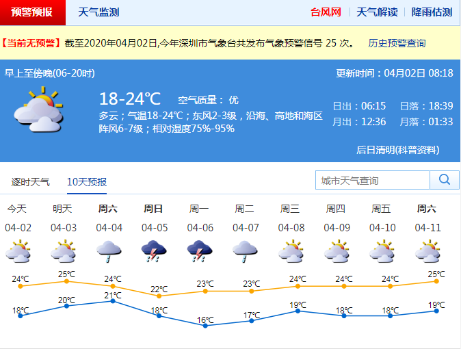 見圳客戶端·深圳新聞網(wǎng)2020年4月2日訊 深圳市氣象局預(yù)計(jì)2日陰天間多云,有分散陣雨,沿海和高地偏東陣風(fēng)6-7級(jí),氣溫18-22℃;3日多云間陰天,有輕霧和分散陣雨,氣溫略升;展望清明假期(4-6日)有一次明顯降雨過程,間中伴有雷暴。7日降雨結(jié)束。