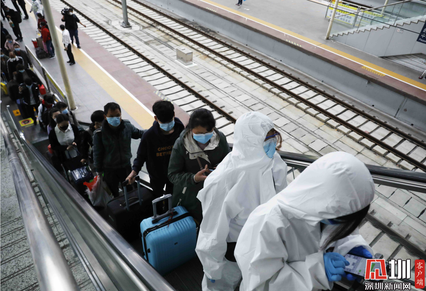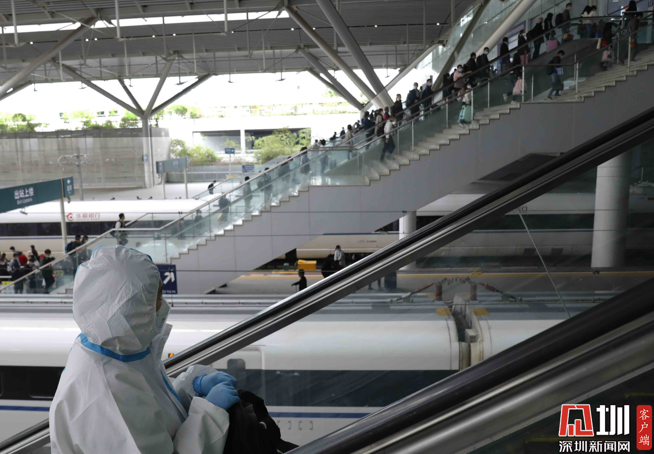 深圳北西廣場出口處,安檢人員正在檢測旅客體溫。