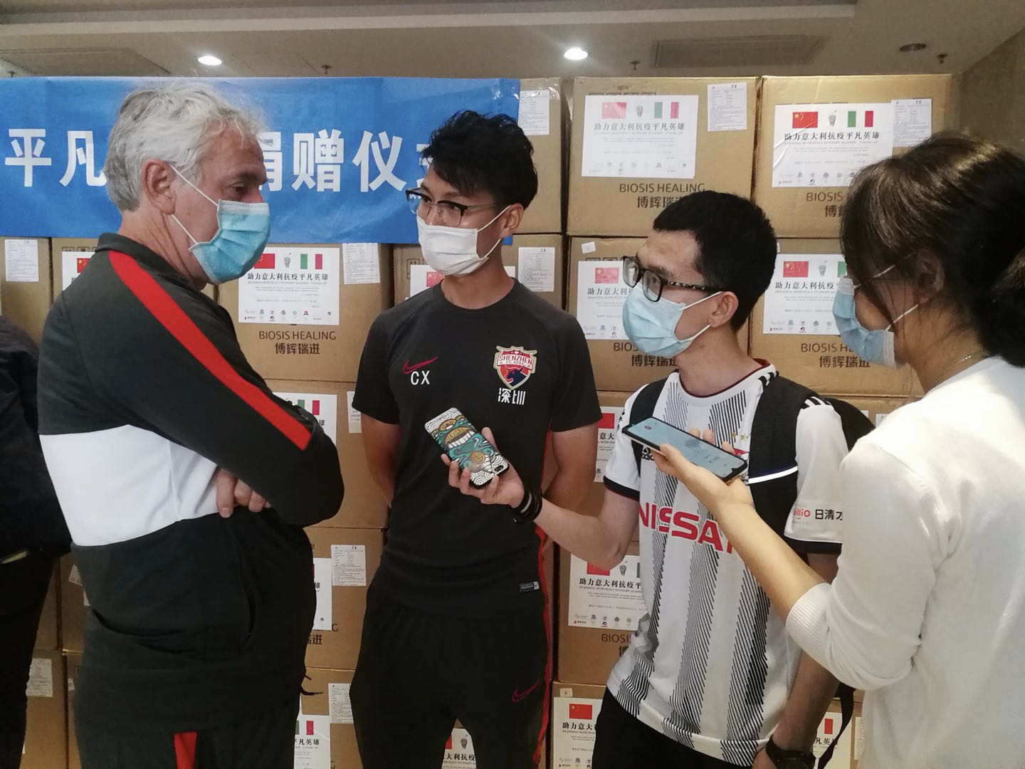 “感謝深圳?!碑?dāng)天,AC米蘭俱樂部前教練、深圳佳兆業(yè)足球隊主教練多納多尼作為在深意大利人代表也來到了活動現(xiàn)場。他表示,來深圳不到一年,已經(jīng)深刻感受到深圳的城市魅力?!爸袊谶@次抗擊疫情的過程中表現(xiàn)完美,每個人的一舉一動不僅是為自己,更是為別人,這非常令我感動。此次捐贈對于意大利來說十分重要,我代表我的祖國向大家表示由衷的感謝?!倍嗉{多尼在現(xiàn)場動情地說。(記者 許舜鈿)