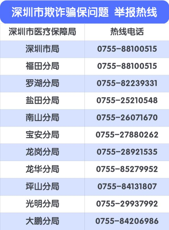 市醫(yī)保局已在深圳市各區(qū)設(shè)立投訴舉報(bào)電話,歡迎廣大市民共同參與醫(yī)?;鸨O(jiān)督管理。市民可通過(guò)實(shí)名舉報(bào)和匿名舉報(bào)方式檢舉、揭發(fā)欺詐騙保行為,經(jīng)查證屬實(shí)的,將根據(jù)《深圳市欺詐騙取醫(yī)療保障基金行為舉報(bào)獎(jiǎng)勵(lì)實(shí)施細(xì)則(試行)》對(duì)舉報(bào)人予以獎(jiǎng)勵(lì),獎(jiǎng)金最高可達(dá)10萬(wàn)元!(記者 莊瑞玉)