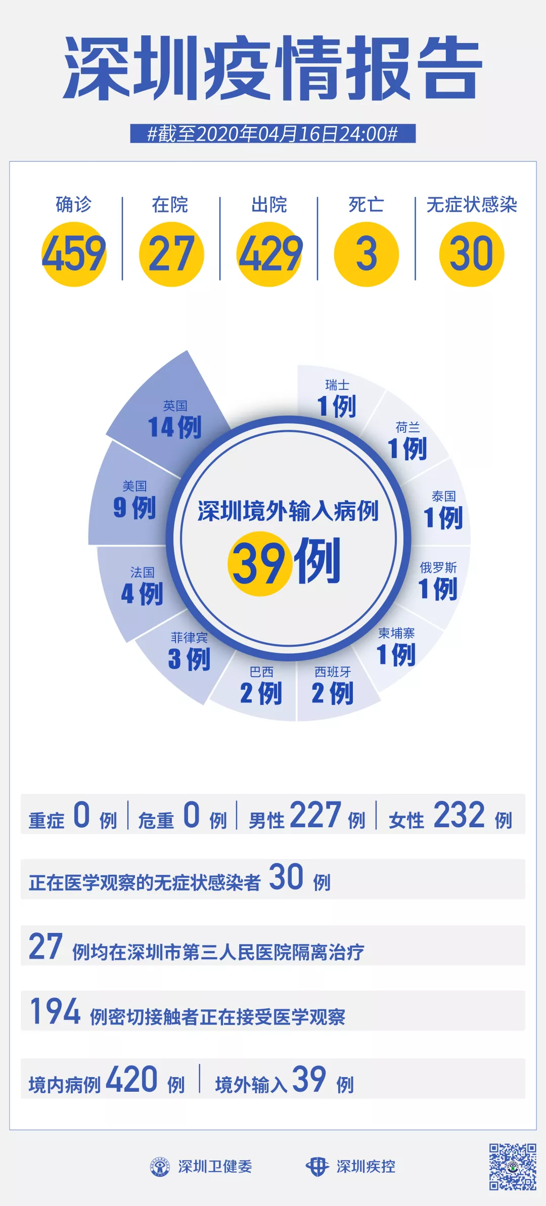截至4月16日24時,深圳累計報告新冠肺炎病例459例。4月16日當天新增境內(nèi)病例1例,新增無癥狀感染者1例。